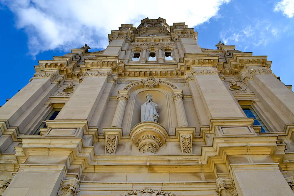 Then over Donna’s shoulder, in the window of a 100-plus-year-old, brownish-red brick home worthy of a Christmas card, I saw a statue outlined by a golden-rod yellow frame. Plaster robes of blue and white caught the scant light. It was the image of Mary, the Immaculate Conception. Her arms stretched out to comfort.