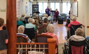 Rod Marino, “the Casual Crooner,” traveled from Chicago to Saint Mary-of-the-Woods to entertain Sisters of Providence and friends at the end of March. He and his wife Diana performed in the Providence Dining Room and in Providence Health Care. Rod also called upon his sister, Providence Associate Mel Marino Wolff, and me, Providence Associate Sheila Donis, to sing along with him.