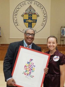 I want to take a moment to thank the leadership of the USCCB for their support of work that puts faith into action to create a more just world. The Bishop’s Conference in Indiana under the leadership of then Archbishop, now Cardinal Tobin, followed by Bishop Rhodes, and soon to be Archbishop Thompson has made social justice a priority. Ralph McCloud, the National Director of the Catholic Campaign for Human Development and our local Archdiocesan Director, David Bethuram, who help ensure the campaign’s ability to change systemic injustice and structures. I also want to note my thanks to the USCCB for their leadership, facilitation, and promotion for the U.S. Regional World Meeting of Popular Movements in California. This was an opportunity for a Gospel encounter at a critical moment for people in our nation. And, of course, I wish to thank my parents and the Sisters of Providence who have formed my faith and continue to do so.