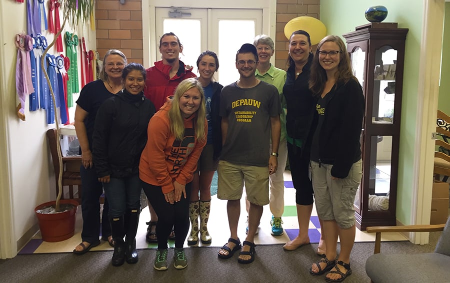 Then, a group of students from the sustainable farm at DePauw University at Greencastle, Indiana, visited. Garden Manager Candace Minster showed them around and answered questions about the ministry. They’re pictured below with Director Lorrie Heber, Sister Mary Montgomery, Candace and myself.