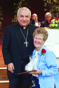 Sister Josephine Bryan received the Florence Nightingale Award from the Diocese of San Bernardino, California, on Oct. 22, 2017. The award is presented to “a licensed nurse distinguished in the field or in a way that reflects Catholic values and moral ethics.” One of the doctors who nominated Sister Josephine said she “has cared for some of the most vulnerable populations I can think of, not just here in Southern California, but internationally in Vietnam … There she compassionately cared for GIs and the Vietnamese themselves. She continues to selflessly serve the poor and marginalized here in the High Desert. She is a team-player, who doesn’t just respect patients and families, but loves them!” Sister Josephine is shown here receiving the award from Bishop Gerald Barnes.