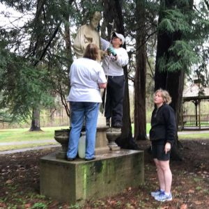 Well, Providence provides! We had a great group of workers, the terrible weather forecast cleared up, and in five hours we cleaned not the one but four statues and a bit of the grounds around them. We knew most people could not work the whole five hours, so we told people to drop in and help for whatever amount of time they could.