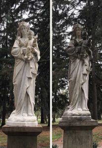 Sister Becky did a little research and identified Mother of Divine Providence, the large statue of Mary and Jesus in Providence Park, as the one statue they would like cleaned. It is in a prominent location near the Log Cabin Chapel and Providence Hall. When I went to look at it, I was secretly concerned that we could not get it as clean as we’d like. It was really discolored. But I also secretly hoped that I could gather enough workers to clean not just that one statue, but also the other three in that same area.