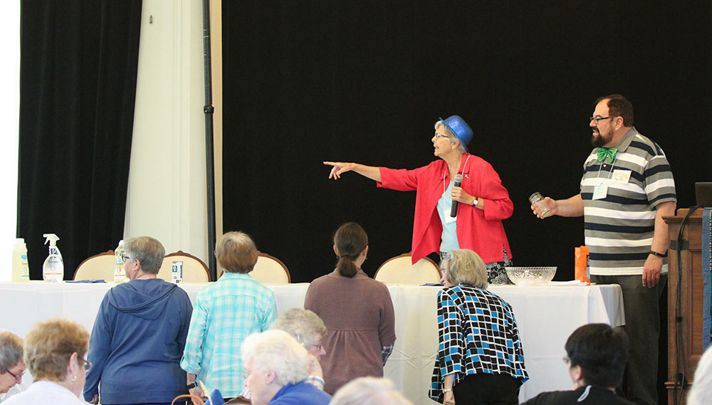Leading a lively game of environmental bingo during the meeting of Sisters of Providence and Providence Associates on Monday are Sister Barbara Sheehan and Providence Associate Gene Majewski.