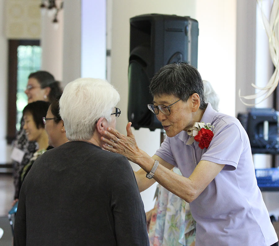 Sister Delan Ma, right, greets Providence Associate Diann Neu.