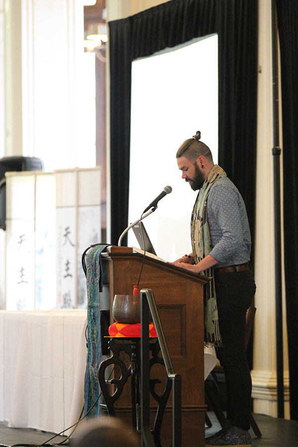 One of the annual meeting organizers, Providence Associate Tara Lane, makes an announcement to all gathered on Saturday morning.