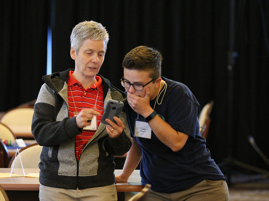 Providence Associate Joan Frisz and Sister Corbin Hannah react to something Joan is sharing.