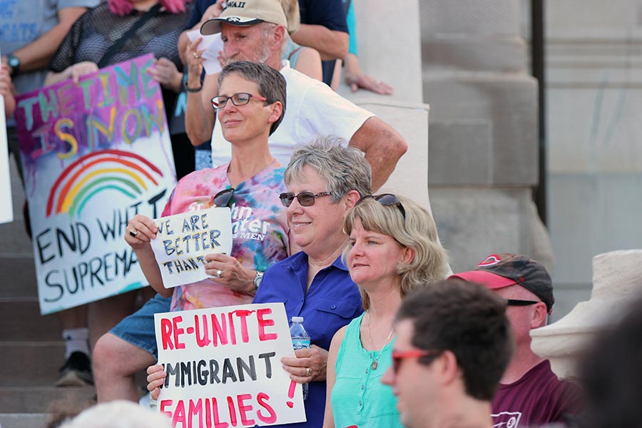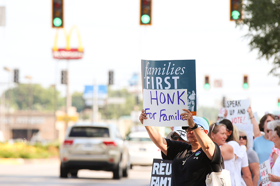 Sister Joni Luna joins a rally against family separation of immigrants in front of the courthouse on Third Street in Terre Haute on Saturday evening.