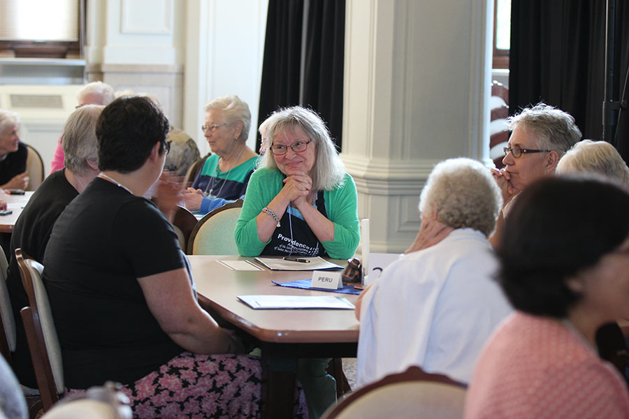 Providence Associate Jeanie McElwain listens to the sisters and associates at her table on Sunday evening.