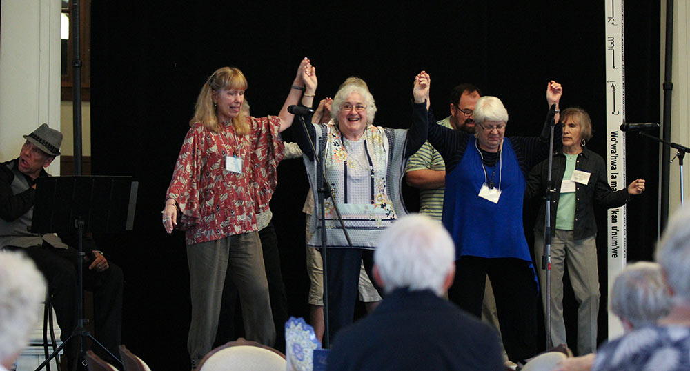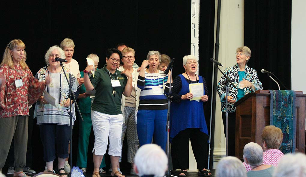 Sisters and associates perform a song parody at the Sunday social. From left, Providence Associates Mel Marino Wolff, Sheila Donis, Jan Surber (back), Sisters Dina Bato, Sue Paweski (back), Terri Grasso, Providence Associate Diann Neu and Sister Mary Montgomery.