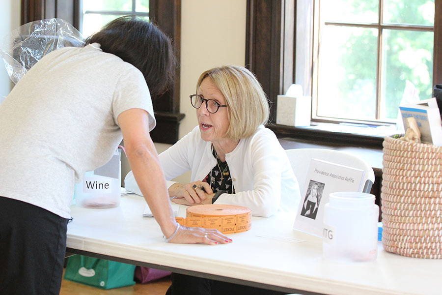 Silent auction organizer Providence Associate Sara Bennett speaks with another associate from the raffle table.