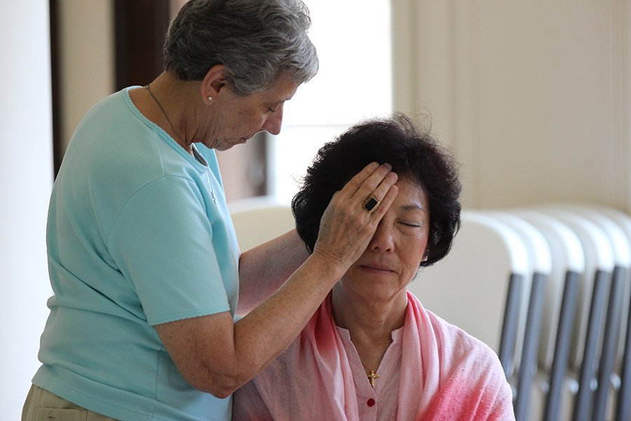Offering a helping hand. Sister Terri Grasso offers healing touch and prayer to Providence Associate Maria Fan at a break in the meeting.