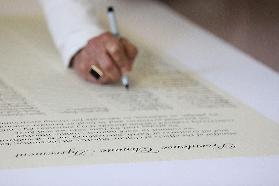 A participant at the Monday meeting signs the Providence Climate Agreement.