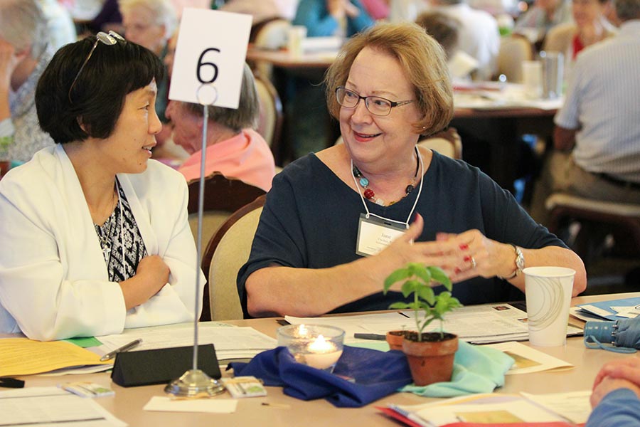 Sister Anji Fan and Providence Associate Jane Fischer speak at their table during Monday’s SP meeting with associates.