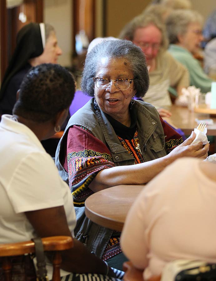 Providence Associate Rita Edwards speaks with a sister at her table