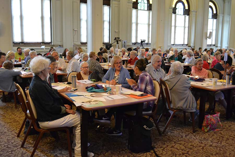 Providence Associate Diane Weidenbenner listens to Sister Emily Walsh at her table during Monday’s Climate Change talk at the sisters’ annual meeting when associates were invited to join the sisters.