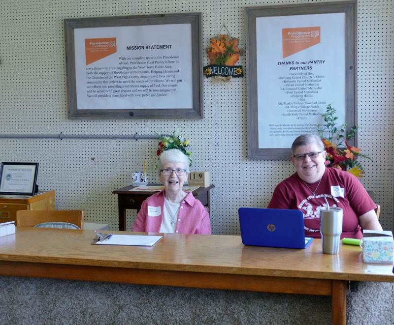 Sister Margaret Quinlan and volunteer Stacy Pierce greet visitors during the 25th anniversary celebration of Providence Food Pantry in West Terre Haute.