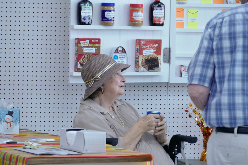 Louise Arnold, a long-time supporter helps answer questions about the pantry’s many partners.