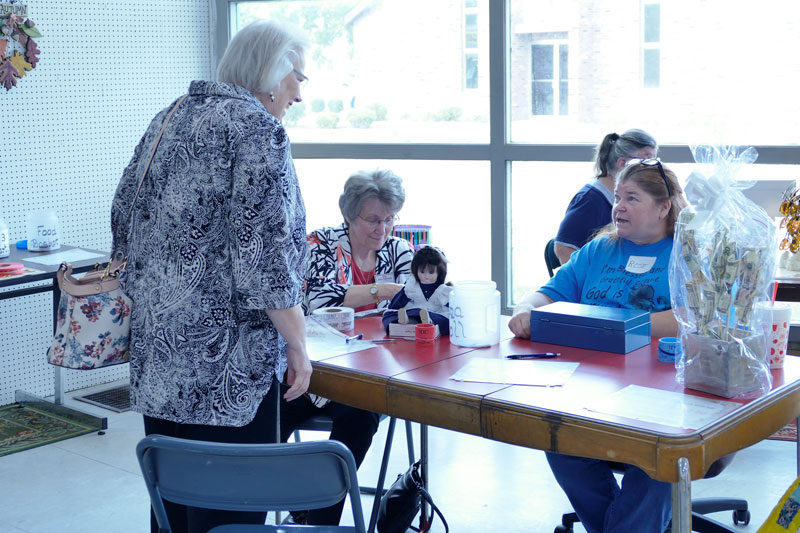 Sue Heck (left) asks a question about the raffle. Sister Jeanne Hagelskamp, general officer liaison to the pantry (center) and Rose sell tickets.