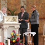 Father Dan Hopcus blesses the new Providence Associate pins held by Providence Associates Shawn Shamsaie and Rosaline Secrest