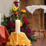 Flowers and candles lit in memory of 2019 deceased Providence Associates Donna Stites and David Hammer adorn the altar