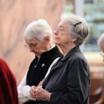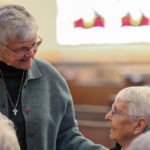 Sister Denise Wilkinson greets Sister Margaret Norris before Mass