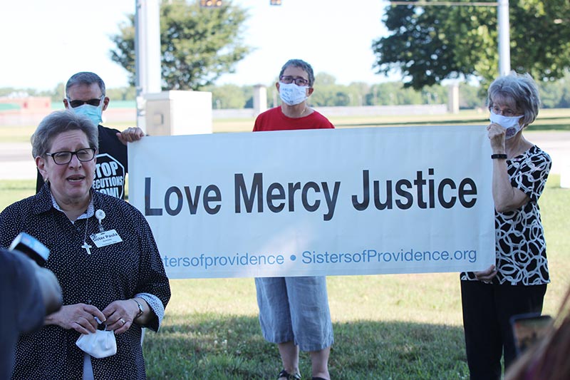 The Sisters of Providence of Saint Mary-of-the-Woods spoke out against, and prayed for, all people impacted by the death penalty and their victims last week. The first federal executions in 17 years took place on July 14, 16 and 17 at the federal penitentiary in Terre Haute, located just 10 miles from the Sisters of Providence motherhouse at Saint Mary-of-the-Woods. The Sisters of Providence held a prayer vigil at Saint Mary-of-the-Woods on Sunday evening. Representatives of the Sisters of Providence also attended and spoke at the Death Penalty Action group’s federal execution press conferences, which took place on July 6 and 13. Sisters of Providence also joined peaceful demonstrations on Monday, Wednesday and Friday afternoons at the corner of U.S. 41 and Springhill Road in Terre Haute, not far from where the executions were taking place.