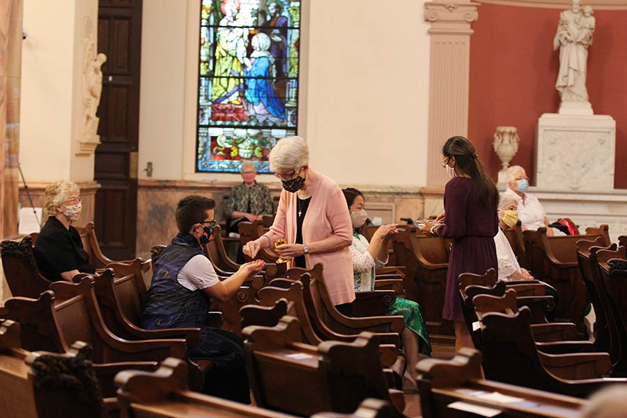 Physically distanced sisters in masks fill the church
