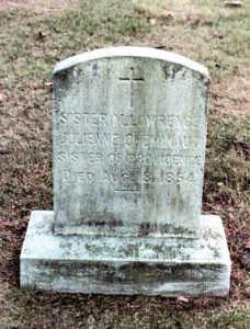 But the Community’s greatest loss to cholera occurred during the next outbreak in the summer of 1854. In Fort Wayne, Sister Lawrence, a lay sister described as a sturdy little peasant girl, wept as the other sisters left for the annual retreat at Saint Mary’s. She had to remain behind to care for the boarders. That summer, cholera once more swept through Fort Wayne. And with skill and courage, Sister Lawrence devoted herself to caring for its victims. On Aug. 18, she herself became ill and she died that very evening.