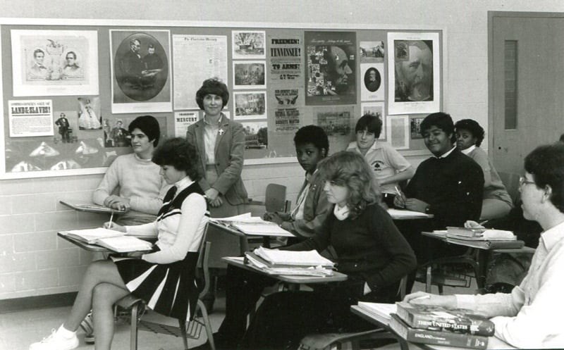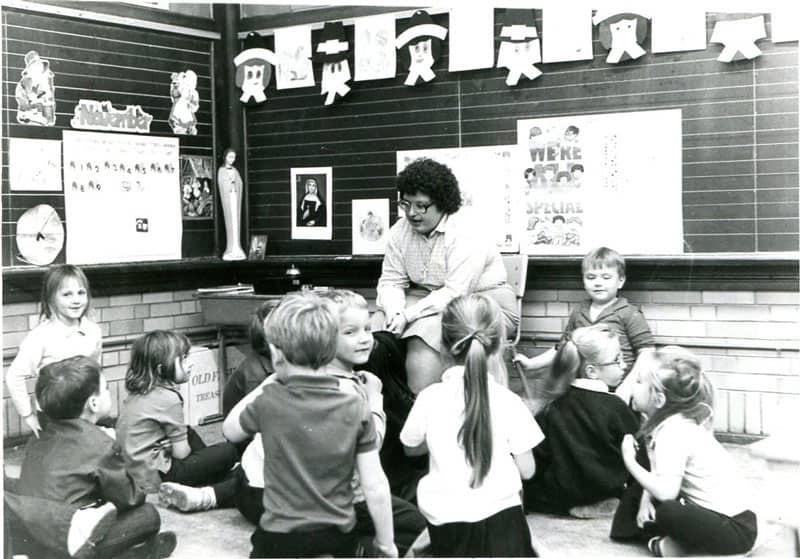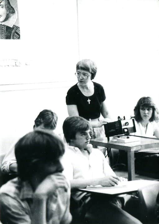 Sister Mary Ann Stewart with her students at Cathedral High School in 1983.