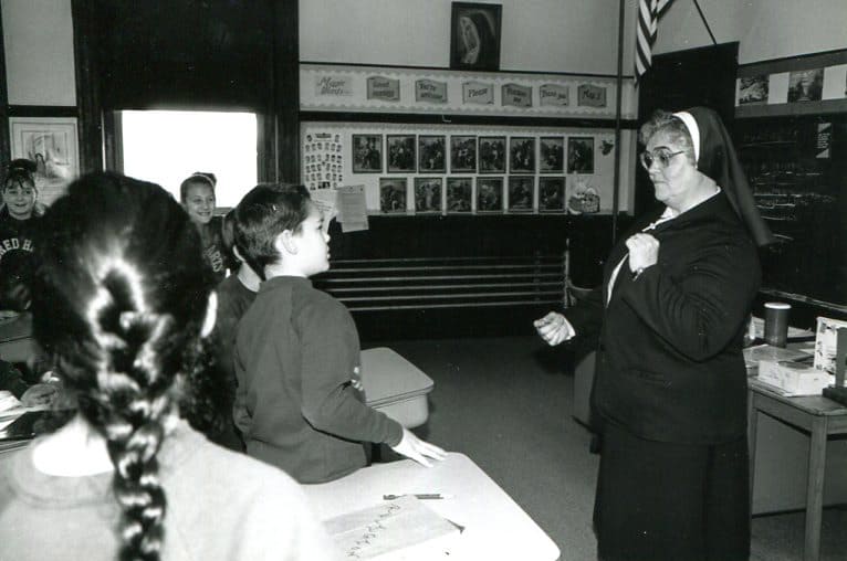 Sister Trinita O’Brien (RIP) speaking with students at St. Rose School, Chelsea, Massachusetts, in 1993.