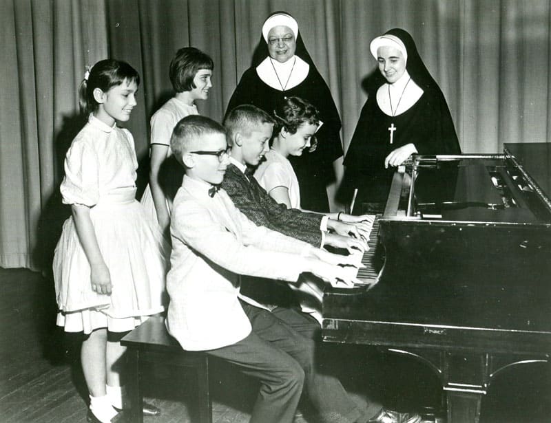 Sister Regina Marie McIntyre (right) with Sister Rose Dolores Thuis (RIP) instructing students on playing the piano at St. Charles Borromeo School in Bloomington, Indiana.