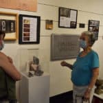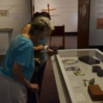 Sister Barbara Bluntzer looking at exhibit pieces.