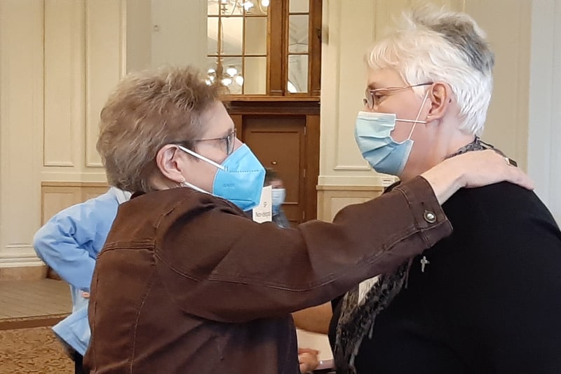 Sister Paula Damiano congratulates Sister Laura Parker