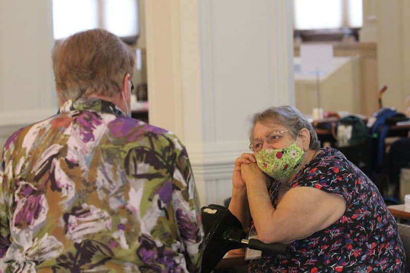 Sister Betty Hopf chats with another sister