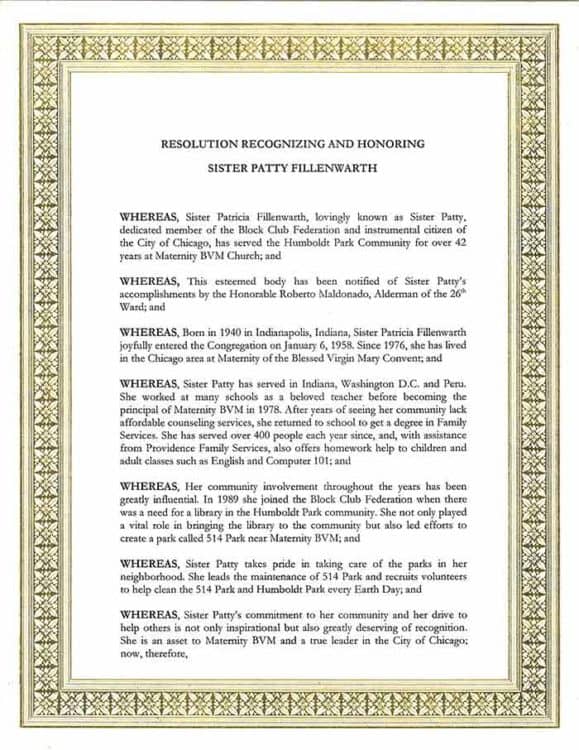Sister Patricia Fillenwarth, SP, was a Sister of Providence and ministered to the people of the Humboldt Park community for 42 years. Sisters of Providence had ministered in the Maternity BVM parish or school for 108 years. Sister Patty was the last Sister to leave when she retired to the SP Motherhouse at Saint Mary-of-the-Woods, Indiana, in 2018. Sister Patty was a fixture in the community. Everyone knew Sister Patty; she had wide community support. She opened Providence Family Services, a center providing bilingual family counseling in 1994, to serve the people of Humboldt Park.