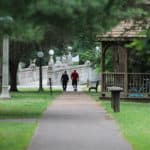 Two associates walk the Woods between sessions.