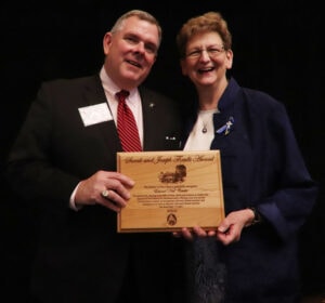 Left, Edward “Ned” Costello receives the Sarah and Joseph Thralls Award, from Sister Dawn Tomaszewski. The award honors significant contributions of time, talent and expertise.