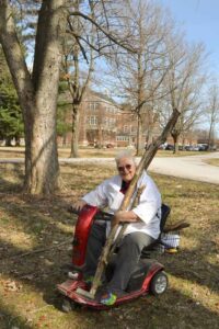 “People are used to seeing me like this,” she says as she balances wood branches on her amigo mobility scooter to bring back to her shop. “This piece could be used for flutes and whistles and rings,” she says. “This might even be good for a walking stick.” The possibilities delight her.