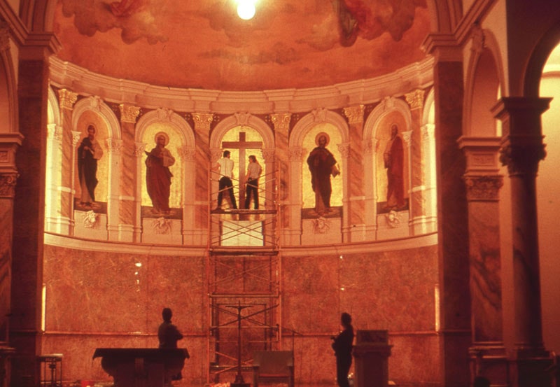 The commissioning of this artwork to Breen was done towards the end of the 1986 renovation of the Church. Harry was initially hired during the beginning of the renovation, which included shoring up and replacing the 101-year-old floor, updating painting and dismantling the old high altar to conform to Second Vatican Council liturgical norms.