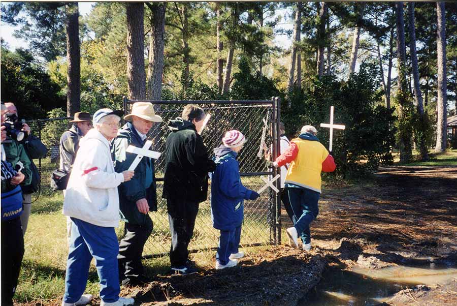 “On the day we did it there were many people who crossed the line, just not that many religious. We crossed the line carrying a cross and singing, ‘Let There Be Peace on Earth’. They arrested us and put us in shackles and handcuffs and put us on a bus and drove us away. There was not enough room in the jail so they put us in an old stockade in town. It was like a dormitory: the sink didn’t work, we had to brush our teeth in the drinking fountain, there were no curtains in the shower or toilet.