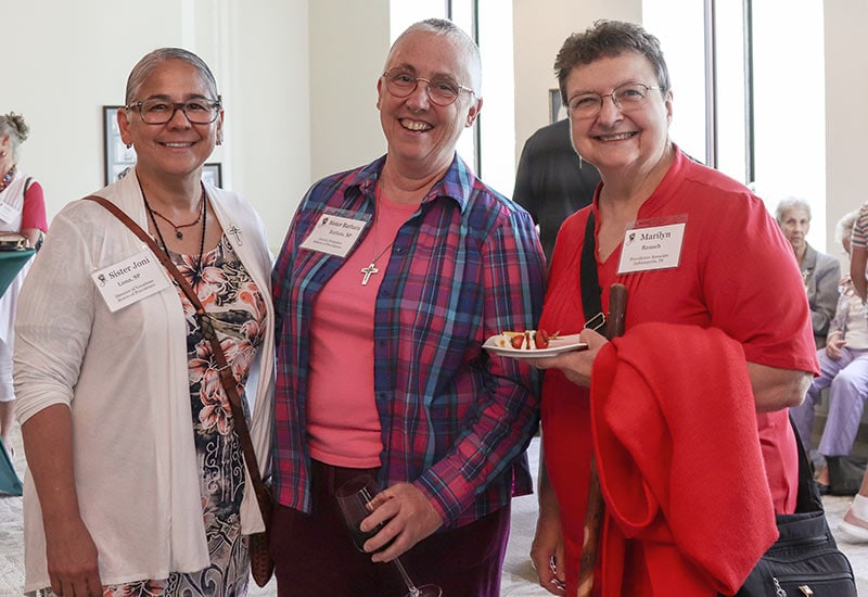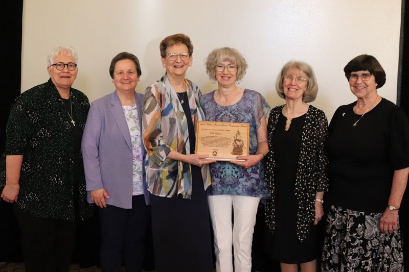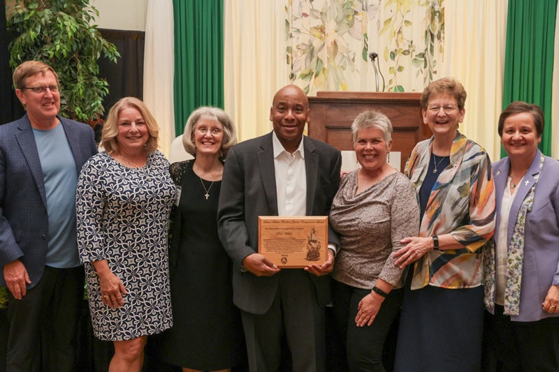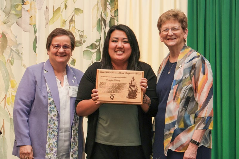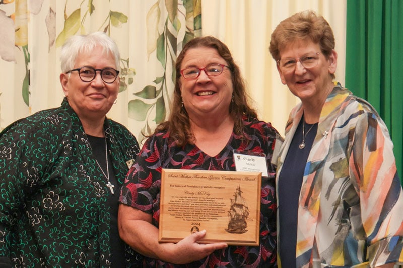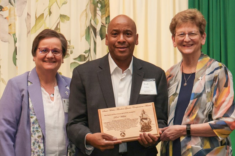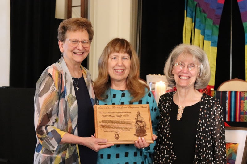 A photo of the 2024 Rooted in Providence award.Sister Joni Luna (left) with Sister Barbara Battista (center) and Providence Associate Marilyn Rausch.Sister Theresa Clare Carr with her brother Ed Carr.This year’s Sarah and Joseph Thralls Award winner Daniel Bluntzer (right) with General Superior Sister Dawn Tomaszewski (left) and Sister Joni Luna.Sister Mary Morley (third from left) along with Ellen Morley Matthews (far right) from the Mary Catherine Morley SP Trust along with General Superior Sister Dawn Tomaszewski (far left) and Vicar/General Treasurer Sister Jeanne Hagelskamp (second from left). Sister Mary and Ellen Morley Matthews were recipients of the Rooted in Providence plaque this year.Several Providence Teen Ministry volunteers pose with their Companion Awards along with Sister Joni Luna (right).One of this year’s Companion Award winners Rosalyn Rawley (center) with General Councilor Sister Anne Therese Falkenstein (left) and General Superior Sister Dawn Tomaszewski (right).One of this year’s Companion Award winners Providence Cristo Rey High School Executive Board Chairperson Rod Willett (center) with General Councilor Sister Anne Therese Falkenstein (left) and General Superior Sister Dawn Tomaszewski (right).One of this year’s Companion Award winners Providence Cristo Rey High School Executive Board Chairperson Rod Willett (center) and others, including Vicar/General Treasurer Sister Jeanne Hagelskamp (third from left), General Superior Sister Dawn Tomaszewski (sixth from left) and General Councilor Sister Anne Therese Falkenstein (far right).One of this year’s Companion Award winners Cindy McKay (center) with General Councilor Sister Laura Parker (left) and General Superior Sister Dawn Tomaszewski.One of this year’s Companion Award winners (fourth from left) with General Councilors (from left) Sister Laura Parker, Sister Anne Therese Falkenstein, General Superior Sister Dawn Tomaszewski, Vicar/General Treasurer Sister Jeanne Hagelskamp and General Councilor Sister Carole Kimes.One of this year’s Companion Award winners, Mel Wolff (center) with General Superior Sister Dawn Tomaszewski (left) and Vicar/General Treasurer Sister Jeanne Hagelskamp.