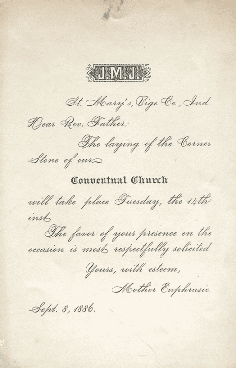 In 1886, the Congregation, under the leadership of General Superior Mother Euphrasie Hinkle, elected to erect a new church at Saint Mary-of-the-Woods. Prior to that, since 1862, the Sisters of Providence utilized a small frame brick chapel.
