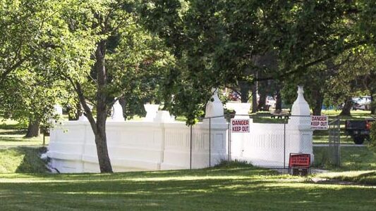 The renovation of Saint Anne Shell Chapel included replacing the exterior stone around the base and adding new drainage. Any structures above ground were heavily weathered and needed to be stabilized. A new door will eventually be installed and additional work done to the interior.
