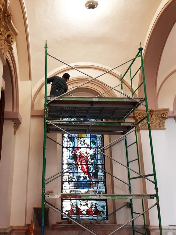 The most obvious of these improvements was in the Church of the Immaculate Conception. Totally renovated in 1986, that paint job was beyond ready for a “facelift.” Chuck explained that this was a major challenge because of the heights involved, up to 50-feet in elevation. Specialized equipment called an articulating lift was initially used. Alas! It damaged the terrazzo floor about three weeks into the project and had to be removed. Enter the entourage of scaffolding workers.