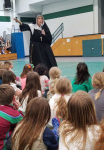 “Sister Susan came to our school full of energy to tell us the story of Saint Mother Theodore Guerin. The girls and boys were totally enthralled by the performance. They wanted her to come back the next week! Sister Sue also told us about the Sisters of Providence of Saint Mary-of-the Woods. It was a fun religion class for all the grades.”