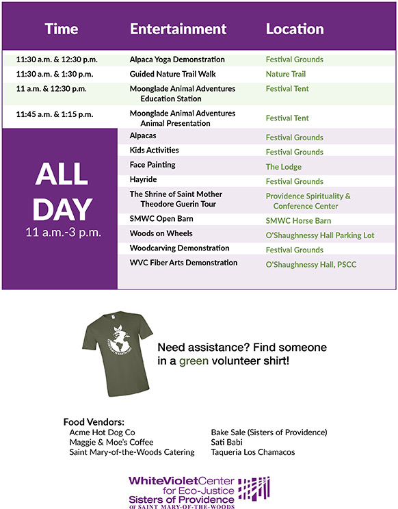 You and the family are invited to the White Violet Center for Eco-Justice and Sisters of Providence annual Earth Day Festival at Saint Mary-of-the-Woods! Immerse yourself in nature at our beautiful Woods while enjoying many different activities. There’s something for everyone from nature shows and earth-related craft activities for the kids, to spinning, weaving and felting demonstrations and visits with the alpacas that provide the fiber.