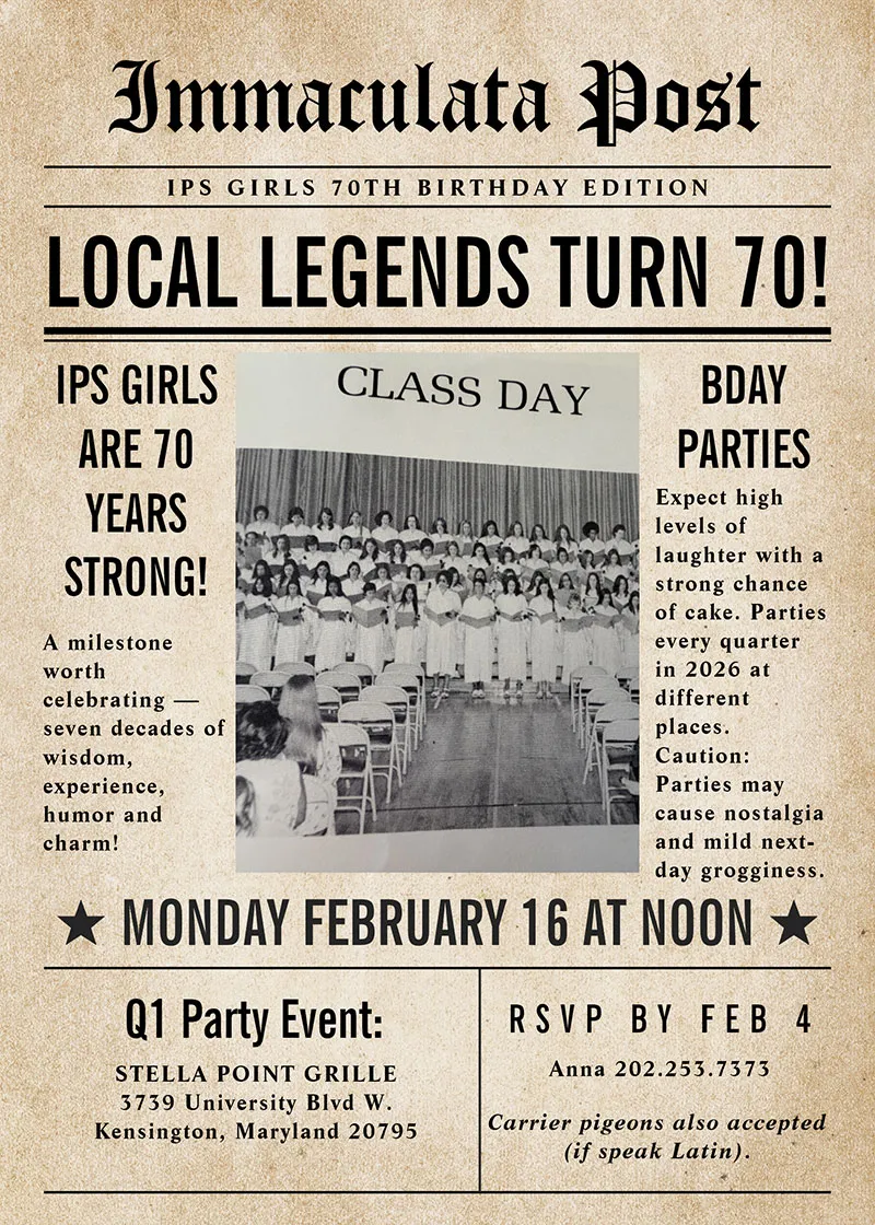 The Class of '74 is turning 70 this year and have designed quarterly birthday parties and invite all classes to come have fun together. This event celebrates Jan-Mar (Q1) birthdays. Don't forget to RSVP to Anna at (202) 253-7373. |