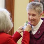 Vicar/General Treasurer Sister Jeanne Hagelskamp (left) pinning a corsage on Sister Claire Hanson.