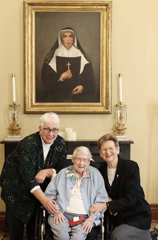Sisters celebrating 75 years with the Congregation this year included (front, from left) Sister Dorothy Ellen Wolsiffer, Sister Eileen Rose Bonner and Sister Ruth Johnson, photographed with (back, from left) General Councilors Sister Laura Parker and Sister Anne Therese Falkenstein, General Superior Sister Dawn Tomaszewski, Vicar/General Treasurer Sister Jeanne Hagelskamp and General Councilor Sister Carole Kimes.